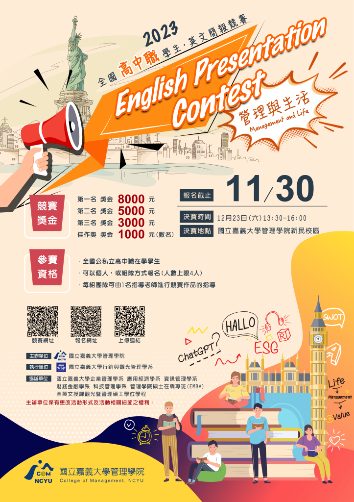 一、 為提升全國高中職學生對管理學院專業學科知識理解與在生活上之應用,透過簡報活動準備,分享在管理知識自主學習獲得的知識,以及展現英文溝通能力。