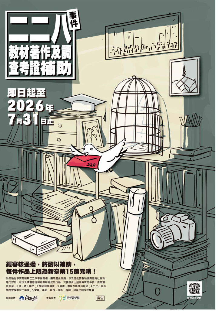 轉知二二八事件紀念基金會115年度「二二八事件教材著作及調查考證補助辦法」Post author:klgsh150Post published:2026-04-28Post category:人事室 / 最新消息 / 校園公告 Post Views: 8Read more articles上一篇文章兒福聯盟 2026 年「兒童權利公約教師研習」及兒童人權桌遊與案例實作工作坊(北區)相關內容這次換我說!108課綱高中職論壇2024-08-05113學年度全國學生美術比賽基隆市初賽實施計畫2024-08-02