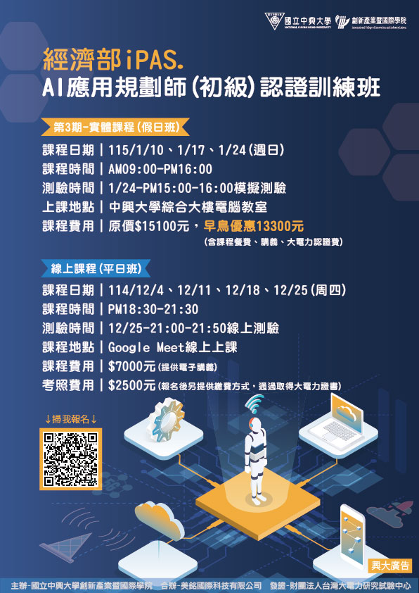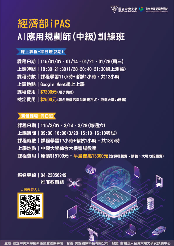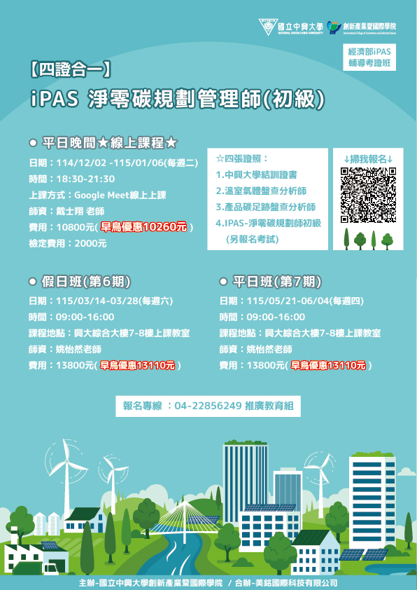 轉知國立中興大學辦理「四證合一-經濟部 iPAS 淨零碳規劃管理師(初級)輔導考證班、經濟部iPAS-AI應用規劃師(初級、中級)輔導訓練班」招生Post author:klgsh150Post published:2025-10-21Post category:人事室 / 最新消息 / 校園公告 Post Views: 11Read more articles上一篇文章Camp Next 2026國際挑戰營下一篇文章轉知115年國民中學(以下簡稱國中)畢業生適性入學高級中等學校及五專宣導講師培訓及到校宣導案相關內容置頂公告112-1高二體育班轉學考錄取名單2023-07-24公告禁止或限制遙控無人機飛航活動區域2022-06-28