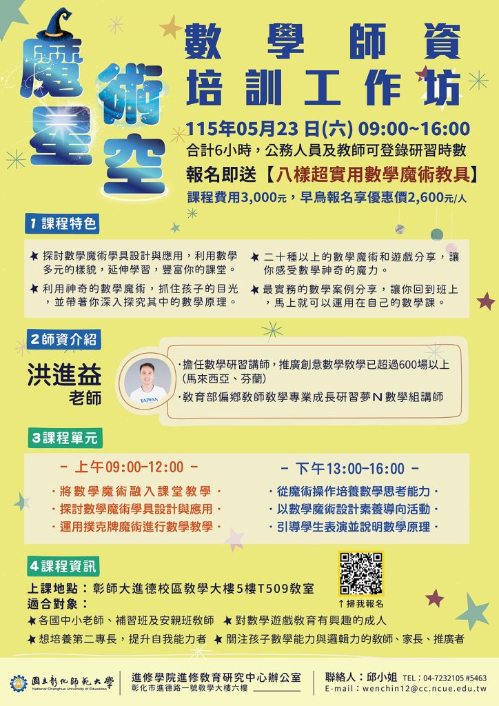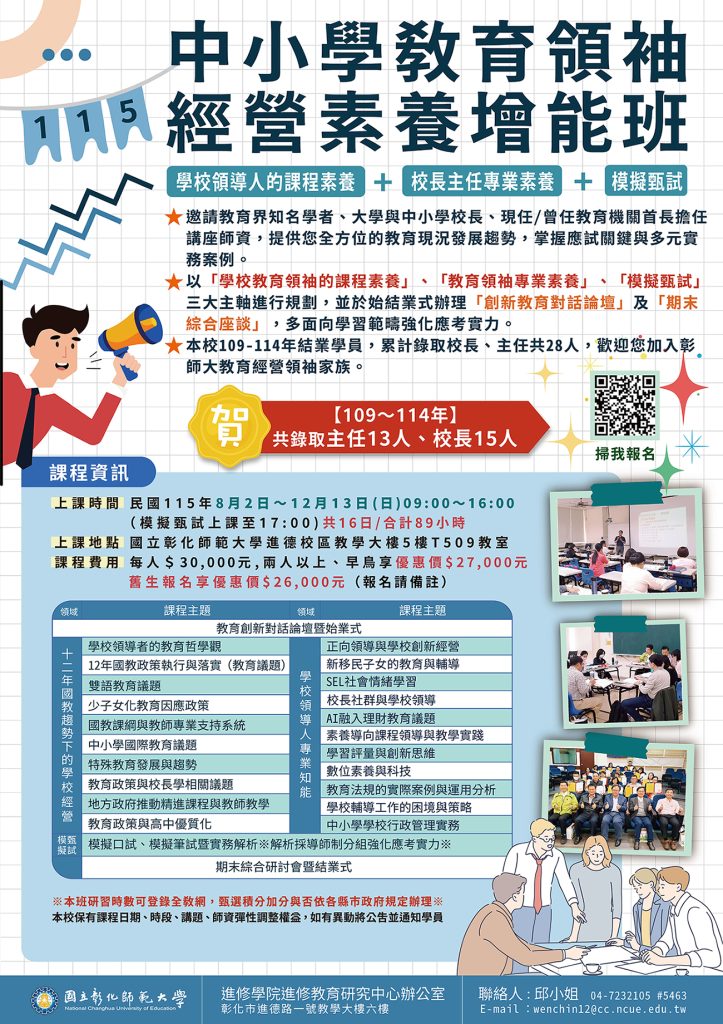 轉知國立彰化師範大學「魔術星空數學師資培訓工作坊」、「課後才藝安親照顧培訓師乙級鑑定輔導班」、「115年中小學教育領袖經營素養增能班」Post author:klgsh150Post published:2026-04-21Post category:人事室 / 最新消息 / 校園公告 Post Views: 13Read more articles上一篇文章114 學年度北區英文演講比賽校內初選得獎名單下一篇文章轉知配合衛生福利部「第五期國家癌症防治計畫(2024-2030年)」,公務人員一般健康檢查實施要點,業將子宮頸癌、口腔癌、乳癌、大腸癌及肺癌篩檢列為檢查項目相關內容東吳大學人文社會學院執行「教育部補助生命教育教學社群與課程發展實施計畫」辦理「生命教育推動現況與展望:國教與高教的銜接」專題演講,歡迎教師報名參加。2023-02-22114學年第一學期中學生網站閱讀心得寫作暨小論文寫作比賽計畫及時程2025-07-16