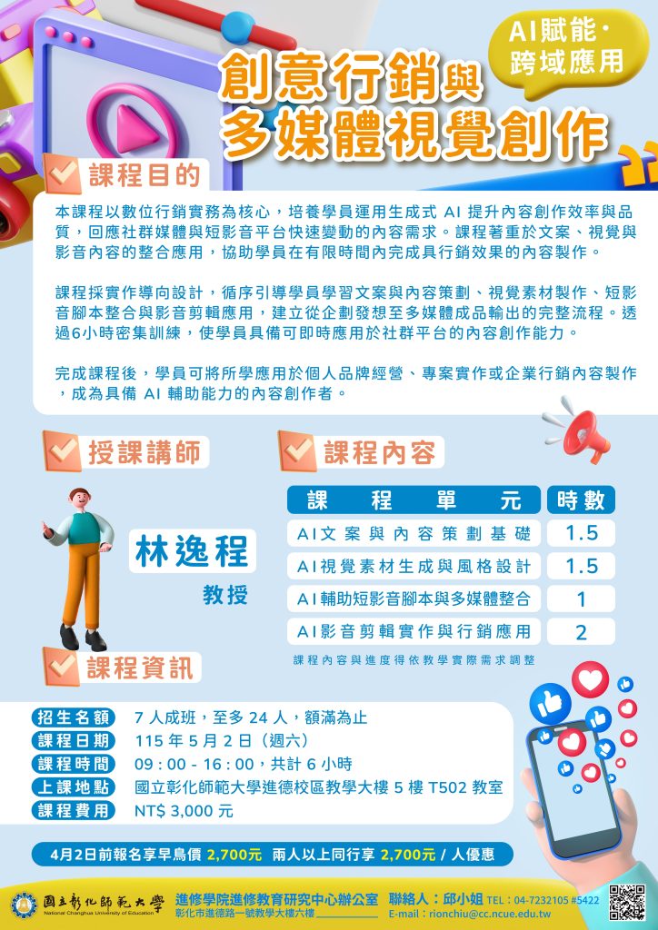 轉知國立彰化師範大學進修學院推廣教育課程「AI賦能-跨域應用:學術研究與論文寫作:從文獻回顧到論文潤飾」、「【AI賦能.跨域應用】創意行銷與多媒體視覺創作」課程簡章Post author:klgsh150Post published:2026-03-06Post category:人事室 / 最新消息 / 校園公告學術研究與論文寫作:從文獻回顧到論文潤飾下載【AI-賦能.跨域應用】下載 Post Views: 22Read more articles上一篇文章轉知國立宜蘭大學敬邀貴校推薦學生參加「2026人工智慧與現代管理理論與實務研討會」之「潛力新秀場次(Rising Scholars Session)」論文發表活動,請查照。相關內容轉知114年全國性公民投票宣導2025-08-1210/23補發學生證名單2025-10-23