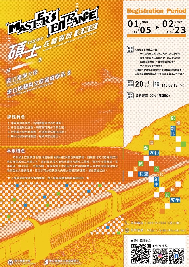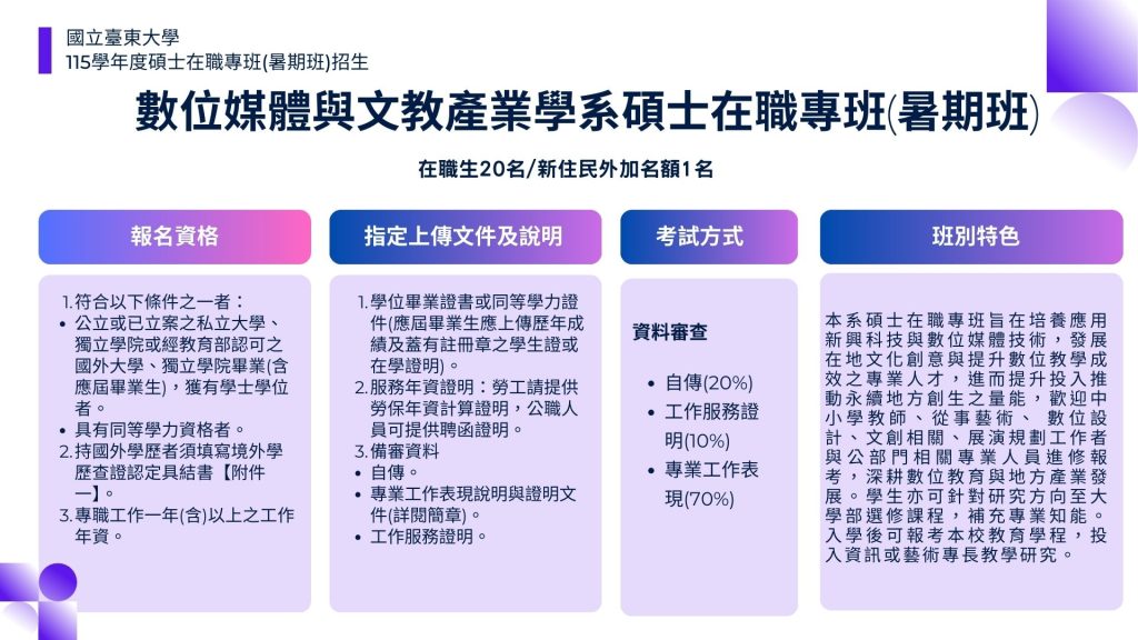 轉知國立臺東大學數位媒體與文教產業學系「碩士在職專班(暑期班)」招生Post author:klgsh150Post published:2026-02-05Post category:人事室 / 最新消息 / 校園公告 Post Views: 8Read more articles上一篇文章轉知財團法人開放文化基金會辦理「2026年SITCON學生計算機年會」海報,請鼓勵貴校學生踴躍報名,請查照。相關內容公告111學年高三上、下【重補修】報名至5/31(三)17:00前,逾時不候2023-05-25轉知「個人資料保護委員會籌備處暫行組織規程」、「個人資料保護委員會籌備處辦事細則」及「個人資料保護委員會籌備處編制表」施行日期2023-12-19