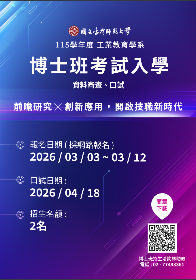 轉知國立臺灣師範大學工業教育學系「115學年度博士班考試入學」招生Post author:klgsh150Post published:2026-01-28Post category:人事室 / 最新消息 / 校園公告 Post Views: 5Read more articles上一篇文章2026『逗深坑』餐旅創意行銷競賽下一篇文章轉知「Kono電子雜誌及資料庫線上教育訓練送星巴克飲料券」相關內容轉知檢送「113年度全國性多元文化教育優良教案甄選」簡章1份,徵件截止日113年9月20日,歡迎踴躍報名參加,請查照。2024-04-29轉知衛生福利部食品藥物管理署製作「防範諾羅病毒食品中毒很簡單!」影片連結,請多加運用並協助宣導週知。2022-05-30