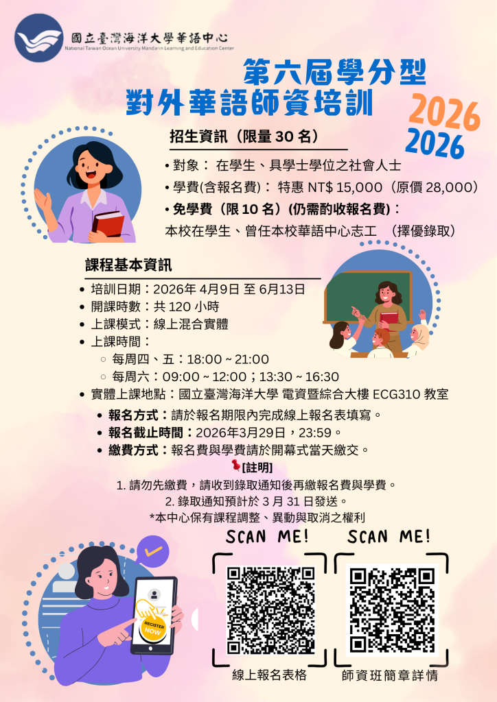 國立臺灣海洋大學2026年 第六屆學分型對外華語師資培訓班招生Post author:klgsh150Post published:2026-03-20Post category:人事室 / 最新消息 / 校園公告2026年-第六屆學分型對外華語師資培訓班招生簡章下載 Post Views: 6Read more articles上一篇文章為強化前瞻科技教育並呼應政府推動之「AI新十大建設」政策方向,本校擬於115年3月27日辦理「高中生的第一堂量子科技課」專題講座,特邀請台灣IBM公司技術長莊士逸先生,蒞校分享量子科技發展趨勢與產業觀點,敬邀貴校師生踴躍參與。下一篇文章【 曙光女中】「混沌少年」系列講座:解讀青春的隱喻與出口相關內容本土語文認證培訓實施計畫─112年原住民族語認證加強班(9月)2023-08-22函轉衛生福利部社會及家庭署(下稱社家署)更新之未成年子女遭父母(或親屬)擅帶離家失蹤案件協尋作業流程及相關通報表等表件(如附件)2022-11-30