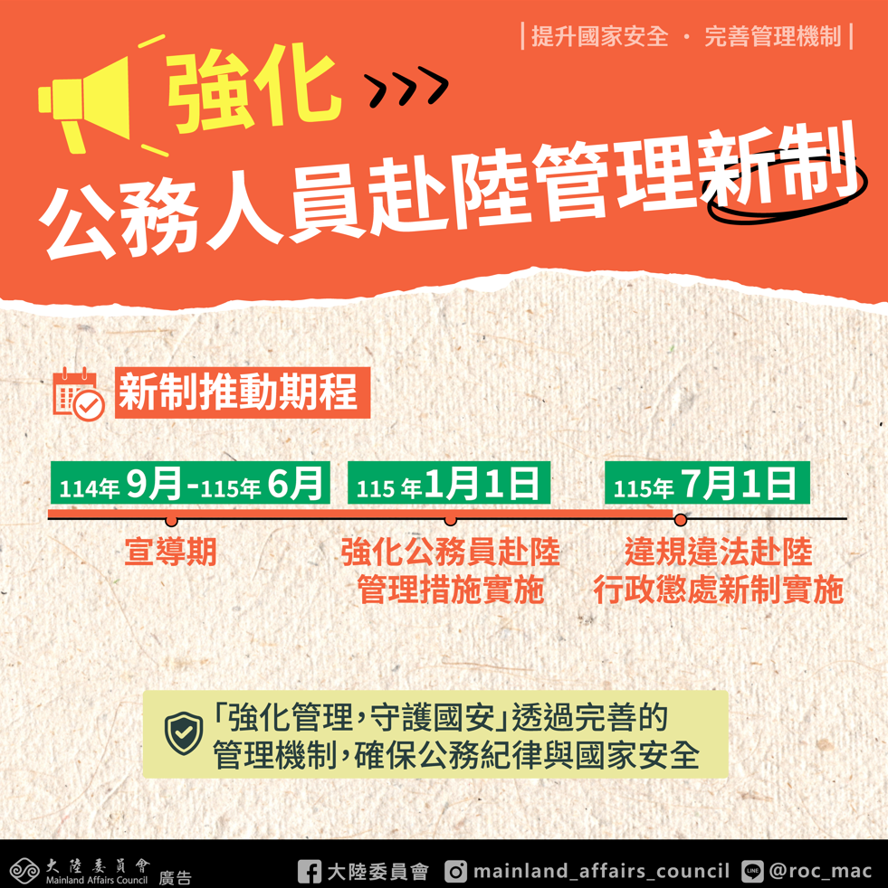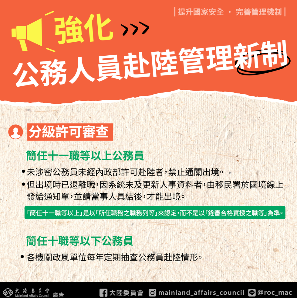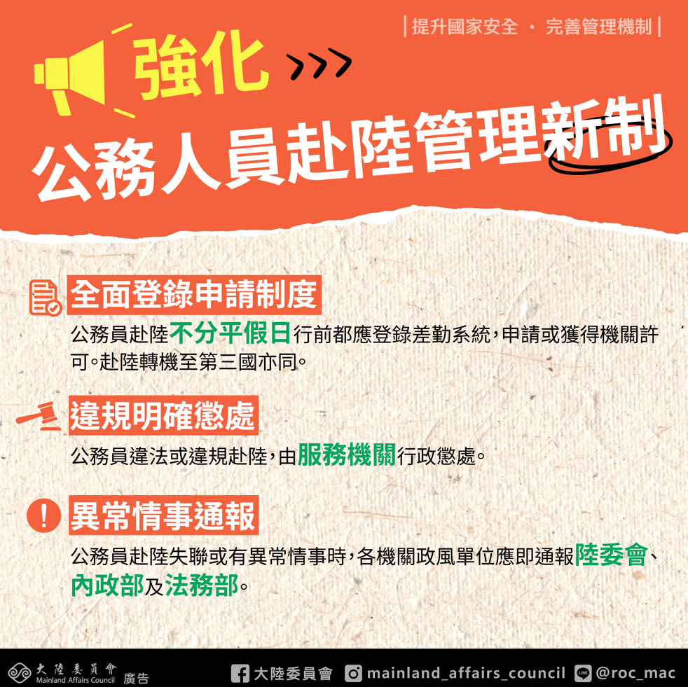 轉知強化公務員赴陸港澳管理措施Post author:klgsh150Post published:2025-11-03Post category:人事室 / 最新消息 / 校園公告強化公務員赴陸港澳管理機制精進措施下載 Post Views: 9Read more articles上一篇文章轉知南華大學人文經典系列【創藝木頭人】(第三期):魯班鎖便擕實木桌課程資訊下一篇文章「全民英檢」新年度初級、中級測驗,開放報名中,鼓勵學生參加。相關內容公告基隆女中校園明信片比賽2022-11-18文藻外語大學國際事務系辦理「世界咖啡館 國際事務體驗營」2024-02-16