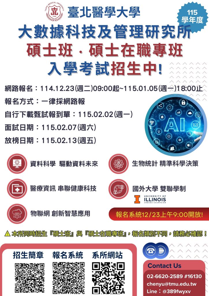 轉知臺北醫學大學大數據科技及管理研究所碩士班/碩士在職專班115學年度入學招生Post author:klgsh150Post published:2025-12-24Post category:人事室 / 最新消息 / 校園公告臺北醫學大學-115-學年度下載 Post Views: 7Read more articles上一篇文章轉知國立臺北大學「114學年度犯罪學碩士學分班」招生下一篇文章轉知國立臺灣師範大學工業教育學系「115學年度技職教育數位碩士在職專班」招生相關內容「2025冬令營-高中企管營」/相關單位2024-10-21轉知國立臺北大學113學年度進修學士班招生簡章2024-03-18