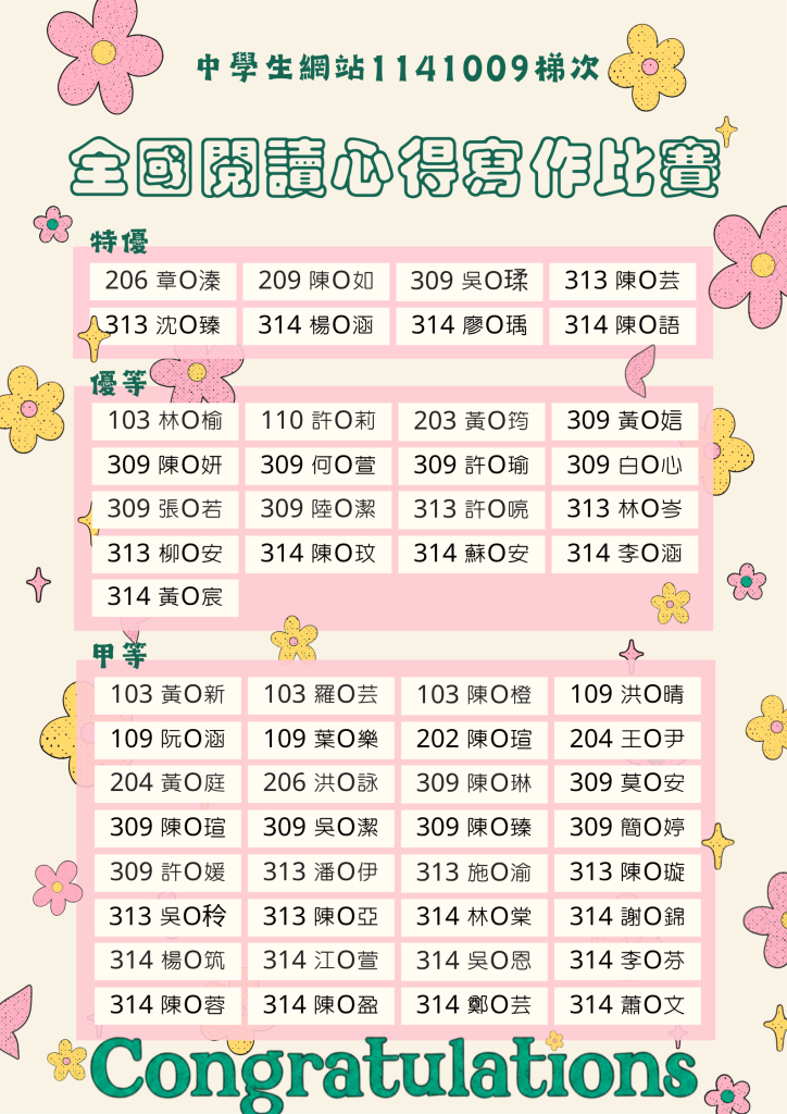 中學生網站1141009梯次全國閱讀心得寫作比賽得獎公告