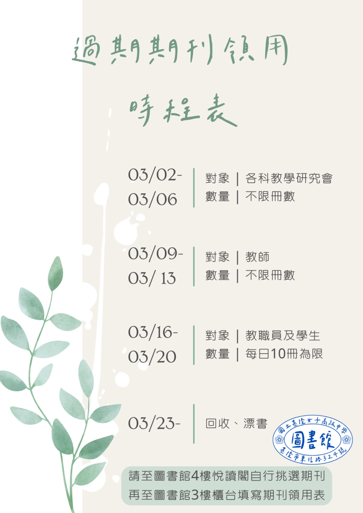 過期期刊放置於圖書館4樓悅讀閣,請先告知圖書館人員再上樓領用,領用者自行選取後至圖書館3樓櫃台登記。另,為使過期期刊達有效利用,分四階段進行,如海報所示。