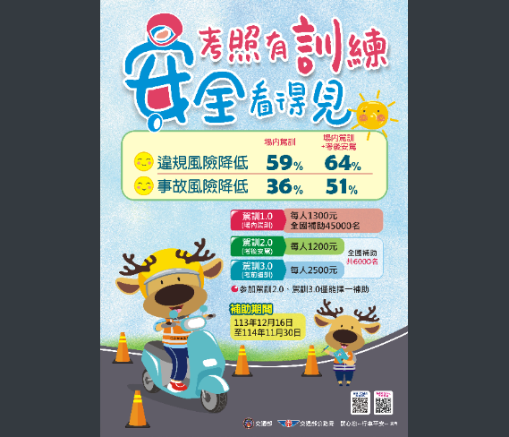 二、為強化學生機車安全駕駛觀念,降低交通意外之風險,落實「推動機車駕訓補助」政策,相關訊息可至交通部公路局「機車駕訓補助專區」網頁瀏覽。