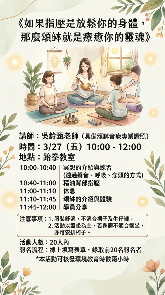 我們特別邀請具備專業頌缽音療證照的 吳鈴甄老師,帶領大家透過精油、冥想與頌缽,展開一場深度療癒之旅。