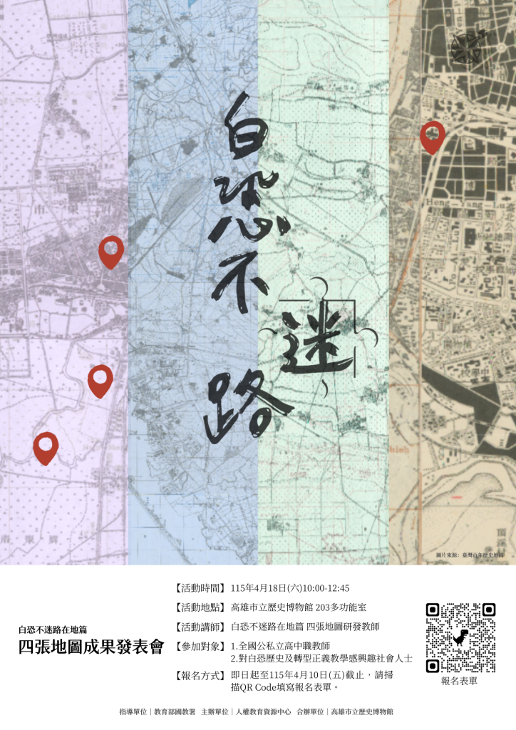 一、為推廣轉型正義教育,本中心歷時兩年研發台北、雲林、高雄及屏東四張「白恐不迷路在地篇」地圖教材,以期透過史料轉譯及地圖應用教案,從日常空間接近不義歷史。