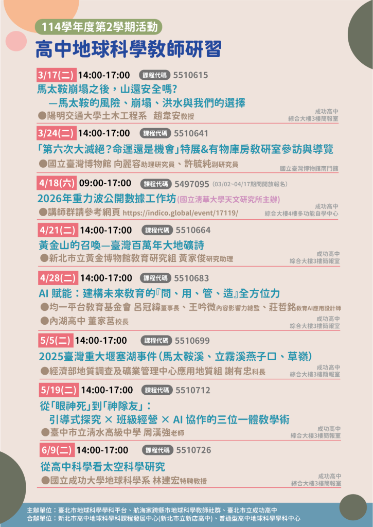 一、本系列活動由臺北市地球科學學科平台、航海家跨縣市地球科學教師社群、臺北市立成功高中主辦,普通型高中地球科學學科中心與新北市普通高級中學地球科學學科課程發展中心合作辦理。