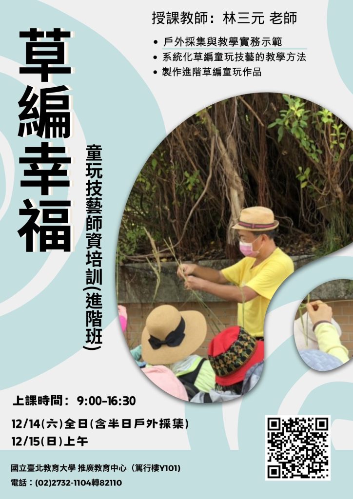 二、 草編幸福-童玩技藝師資培訓(進階班):113年12月14日(六)及12月15日(日)共9小時,全勤並通過評核將核發研習證明書。課程特聘專業草編達人「草編CEO林三元老師」親授,包含戶外採集、戶外與教室型態的教學示範、教學計劃撰寫、教學經驗分享等,歡迎18歲以上對草編童玩有興趣之教師或一般民眾報名。