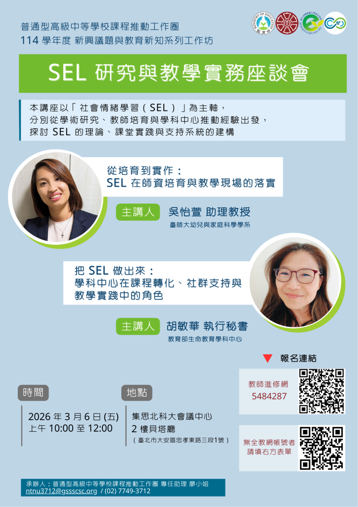 一、旨揭活動係教育部國民及學前教育署委託國立臺灣師範大學教育學系教育專業發展中心辦理,邀請來自國立臺灣師範大學幼兒與家庭科學學系吳怡萱助理教授、教育部生命教育學科中心胡敏華執行秘書,以「社會情緒學習(SEL)」為主軸,分別從學術研究、教師培育與學科中心推動經驗出發,探討SEL的課堂實踐與支持系統的建構。