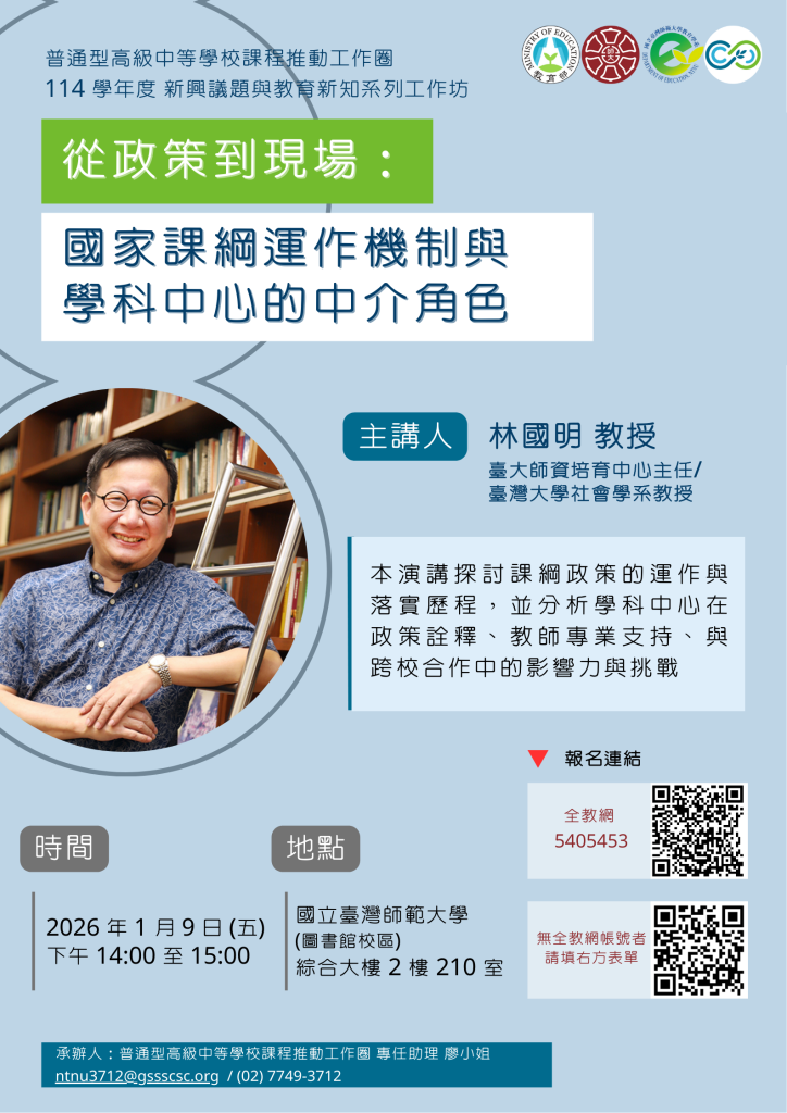 一、旨揭活動係教育部國民及學前教育署委託國立臺灣師範大學教育學系教育專業發展中心辦理,邀請來自國立臺灣大學師資培育中心主任林國明教授,探討課綱政策的落實歷程,並分析學科中心在政策詮釋、教師專業支持、與跨校合作中的影響力與挑戰。