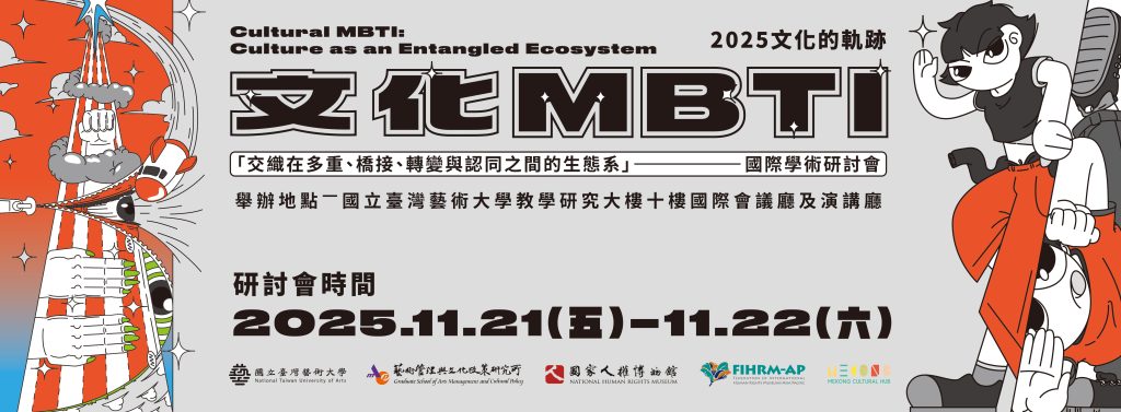 一、國立臺灣藝術大學藝術管理與文化政策研究所、國家人權博物館、國際人權博物館聯盟-亞太分會、國際生活藝術組織台灣辦事處(又名:湄公河文化中心)合辦之「文化 MBTI——交織在多重、橋接、轉變與認同之間的生態系」-國際學術研討會於114年11月21日、22日在國立臺灣藝術大學教學研究大樓10樓國際會議廳、演講廳舉行。