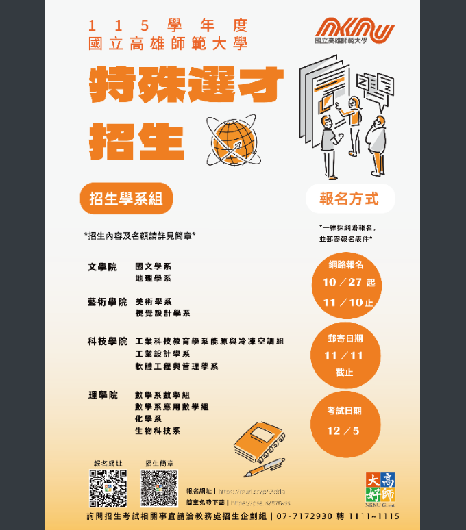 二、特殊選才招生學系:國文學系、地理學系、美術學系、視覺設計學系、數學系(數學組、應用數學組)、化學系、生物科技系、工業設計學系、工業科技教育學系(能源與冷凍空調組)、軟體工程與管理學系、軟體工程與管理學系(資安外加)等12個校系組,提供26名招生名額。