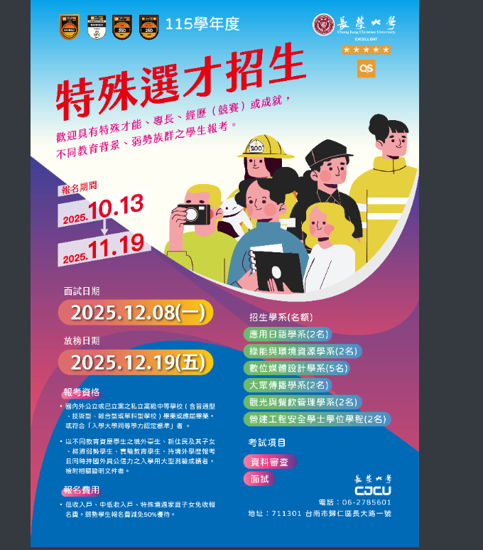 長榮大學115學年度特殊選才招生資訊