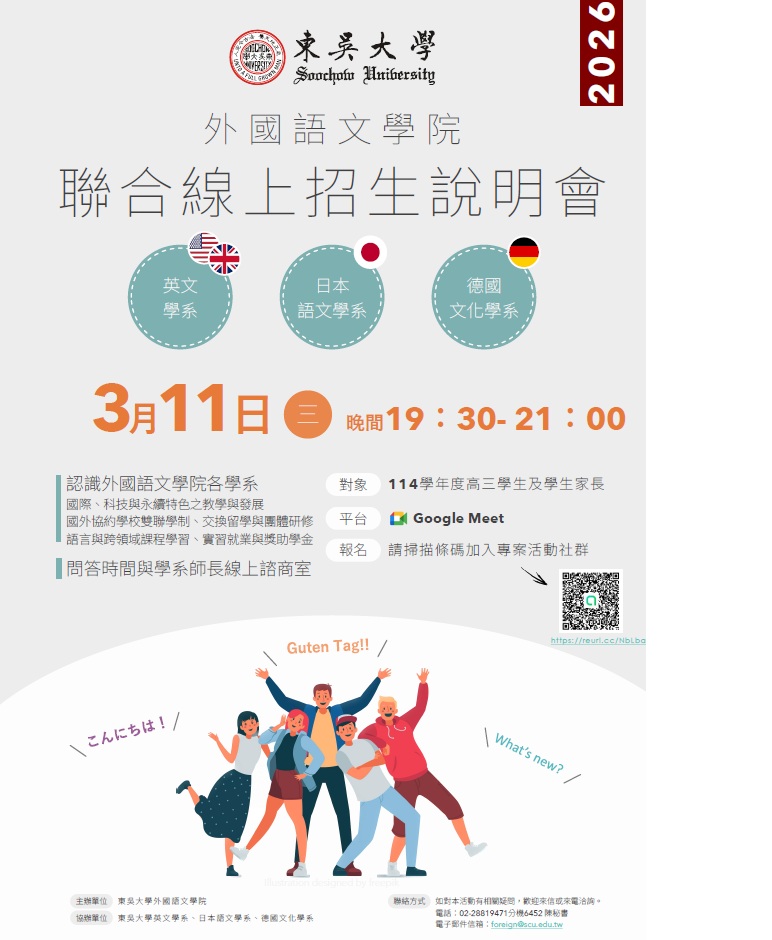 「外國語文學院英文學系、日本語文學系與德國文化學系聯合線上招生說明會」/東吳大學
