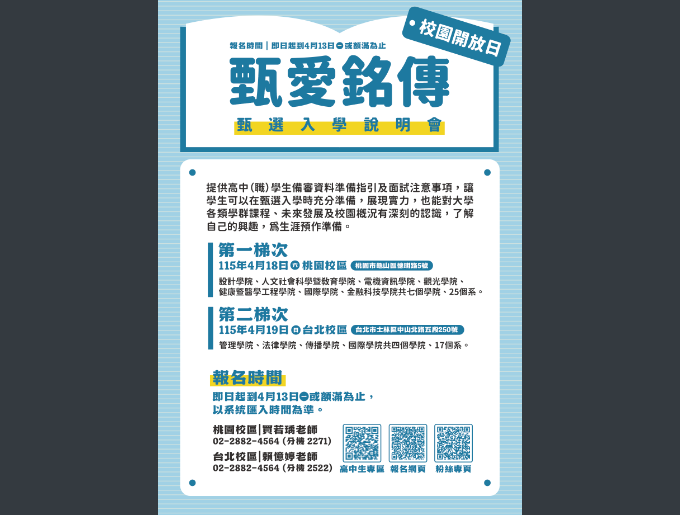 二、4/18(週六)桃園校區設計學院、電機資訊學院、觀光學院、人文社會科學暨教育學院、健康暨醫學工程學院、國際學院、金融科技學院共7個學院25個系;及4/20(週日)台北校區管理學院、法律學院、傳播學院、國際學院共4個學院17個系辦理「甄愛銘傳-甄選入學說明會」校園開放日,即日起開始接受報名,額滿為止。