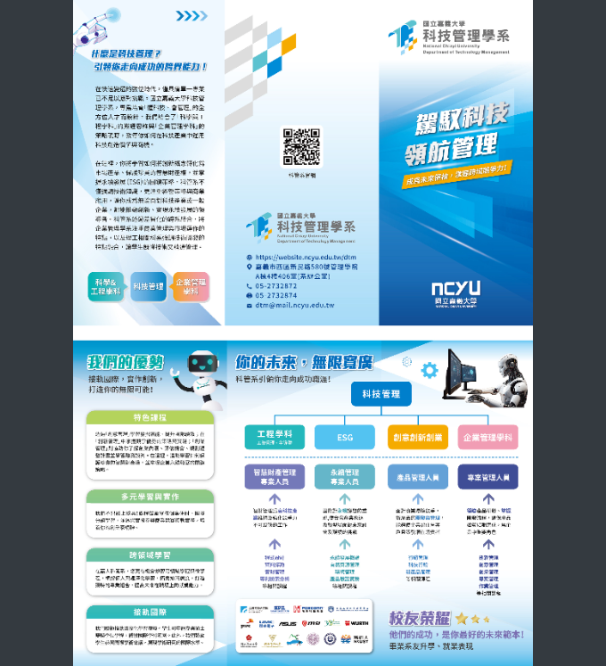 國立嘉義大學管理學院科技管理學系介紹Post author:klgsh600Post published:2025-12-04Post category:大學營隊/認識大學校系課程/活動 / 校園公告 / 輔導室管理學院科技管理學系介紹摺頁電子檔說明:一、本校科技管理學系專為培育「懂科技、會管理」之全方位人才而設計,課程結合理論與實務,涵蓋創新管理、科技應用、ESG等領域,讓學生具備面對數位轉型與全球競爭之能力。畢業後可在企業管理、科技產業及創業發展等領域發揮所長,成為引領未來之關鍵力量。二、歡迎貴校對於三創及永續經營相關領域具濃厚興趣之優秀學子報考。1201嘉義大學下載 Post Views: 7Read more articles上一篇文章義守大學辦理115年寒假營隊「義起探索 Future Camp」活動資訊下一篇文章中原大學知識通訊季刊相關內容國立清華大學材料科學工程學系辦理2024「材料科技研習營《是誰材我的切爾西》」2024-04-08置頂公告國教署最新防疫管理指引,8/15起給假更改規定2023-08-11