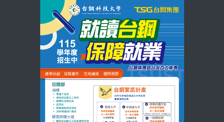 115學年度台鋼科技大學招生宣傳Post author:klgsh600Post published:2026-01-02Post category:大學營隊/認識大學校系課程/活動 / 校園公告 / 輔導室「115學年度台鋼科技大學招生宣傳」台鋼科系活動下載 Post Views: 6Read more articles上一篇文章轉知中山大學全球產學營運及推廣處「法律基礎學士學分班」、「勞資事務師證照班」、「社會保險師證照班」招生下一篇文章轉知高雄市政府教育局(以下簡稱該局)辦理「高雄市115年度『高雄數位學園』網路假期-上網飆寒假作業活動實施計畫」,請貴校鼓勵學生踴躍參加,詳如說明,請查照。相關內容置頂公告112學年度第1學期【期末考】日程表及範圍(更正高一國文、高二化學、213健護)2024-01-02投腦青年行動派.青年志願服務計畫徵件2025-05-29