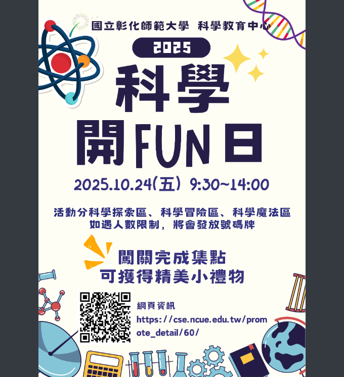 國立彰化師範大學校慶系列將舉辦「2025年科學開Fun日活動」,開放本校理學院教師研究室提供參觀體驗,並同時辦理科趣攤位闖關活動