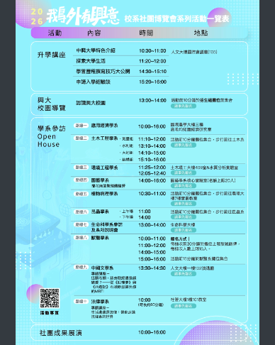 二、本次活動內容包含校系博覽會、OpenHouse校系參訪、升學講座、社團博覽會等,詳細資訊可至FB粉專查詢:「興大鵝外有興意-校系暨社團博覽會」。