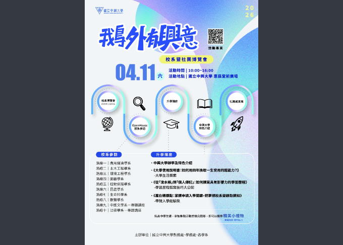 國立中興大學謹訂於115年4月11日(星期六)辦理「2026鵝外有興意-校系暨社團博覽會」活動(詳如附件)