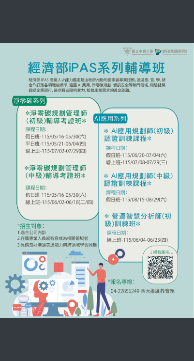 國立中興大學辦理「經濟部iPAS系列輔導班(淨零碳、AI應用及營運智慧分析等課程)」招生資訊。