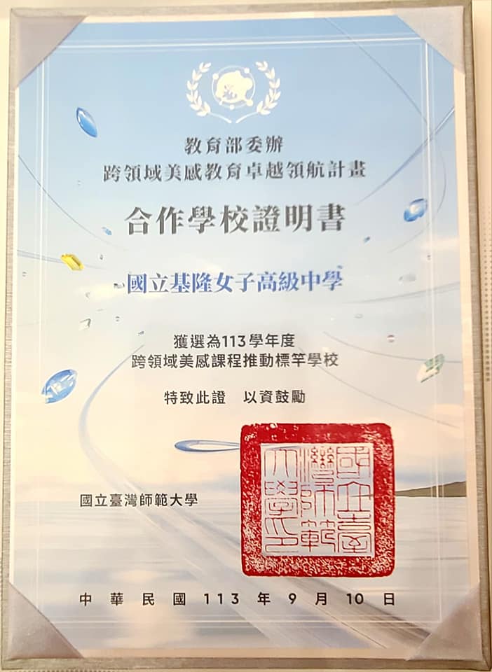 恭喜本校再度榮獲113學年度教育部委辦跨領域美感教育卓越領航計畫合作學校-國立基隆女子高級中學,並獲選為113學年度跨領域美感課程推動標竿學校之殊榮,感謝本校跨領域美感教師社群教師們的努力,展開一系列跨領域美感課程,展望新的合作繼續在校內外與社區,發光發熱!
