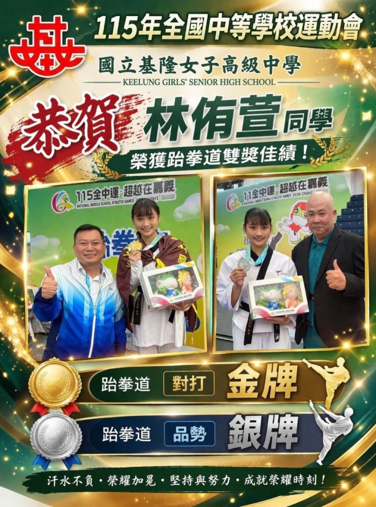 榮譽榮耀時刻:恭賀林侑萱同學榮獲115年全中運跆拳對打金牌、品勢銀牌雙獎。Post author:klgsh311Post published:2026-04-02Post category:最新消息 / 校園公告 / 榮譽榜 Post Views: 1Read more articles上一篇文章轉知國立臺中教育大學辦理「115年適應運動經驗分享及議題交流工作坊」活動。下一篇文章轉知華東臺商子女學校115學年度教師甄選邀請相關內容轉知原住民族委員會定於112年12月10日至113年2月4日舉辦「豐收‧紀實-原住民族委員會成立27週年」特展2023-12-12轉知國立基隆高級中學於114年12月19日(五)辦理「教學行政一把罩:寫出第一支你的無程式工作流」工作坊,請貴校協助公告周知並鼓勵所屬教師踴躍報名參與,並惠允與會人員公(差)假登記,請查照。2025-12-09