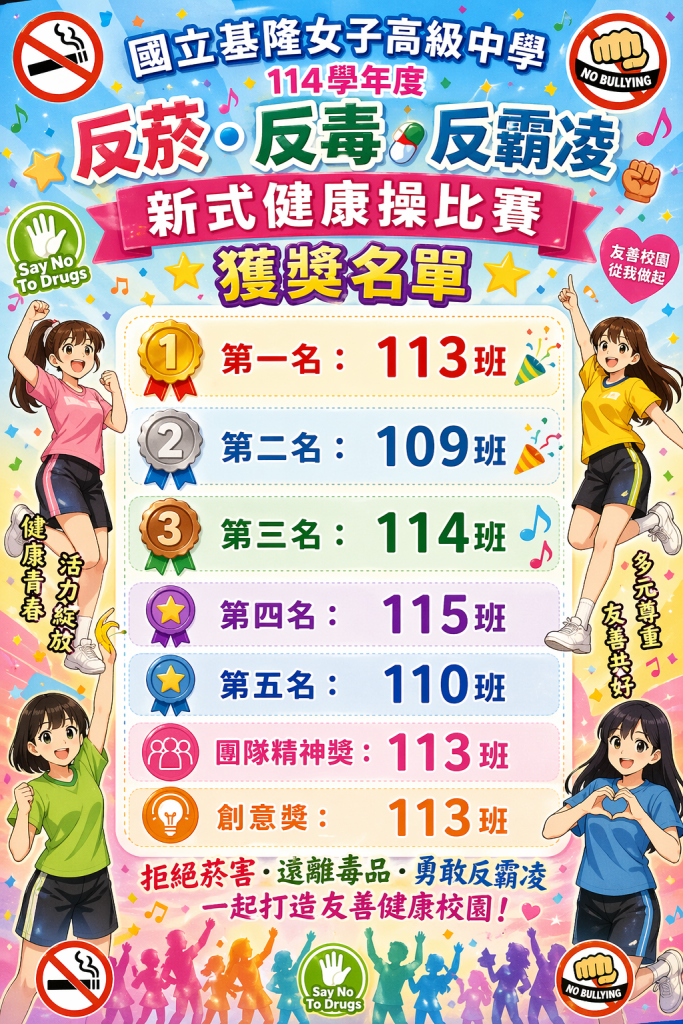 榮譽榮耀時刻:117學年度高一健康操比賽成績公告,恭喜得獎班級,並感謝辛苦指導老師及評審。Post author:klgsh311Post published:2026-04-24Post category:校園公告 / 榮譽榜 Post Views: 9Read more articles上一篇文章大考中心辦理「大學入學考試素養導向命題工作坊–公民與社會科」,鼓勵教師報名下一篇文章115年度推動兒童權利公約兒少兒權培訓實施計畫相關內容轉知國立陽明交通大學辦理「113年資訊素影音創作比賽」活動簡章,惠請協助轉知所轄學校鼓勵學生踴躍報名參加,詳如說明2024-09-02轉知社團法人台灣E化資安分析管理協會訂於112年9月8日(星期五)舉辦資安新知科技-線上影音直播研習課程-「資安鑑識課程-系列Ⅰ初級課程:駭客攻防於萬物聯網(IOT)的勒索事件分析與資安實務」,敬邀貴單位相關人員報名參加2023-08-20