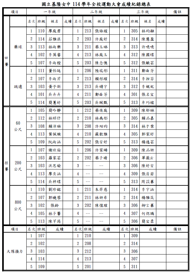 榮譽114學年度全校運動會成績公告,恭喜得獎班級、同學,並感謝辛苦指導老師及裁判Post author:klgsh311Post published:2025-12-02Post category:榮譽榜 Post Views: 7Read more articles上一篇文章中學生網站1141015梯次全國小論文寫作比賽得獎公告相關內容榮譽110學年度本校獎勵優秀國中生完全免試入學獎學金 獲獎名單2021-12-20榮譽恭喜本校學生參與112新北城市盃全國田徑公開賽榮獲佳績2023-09-28