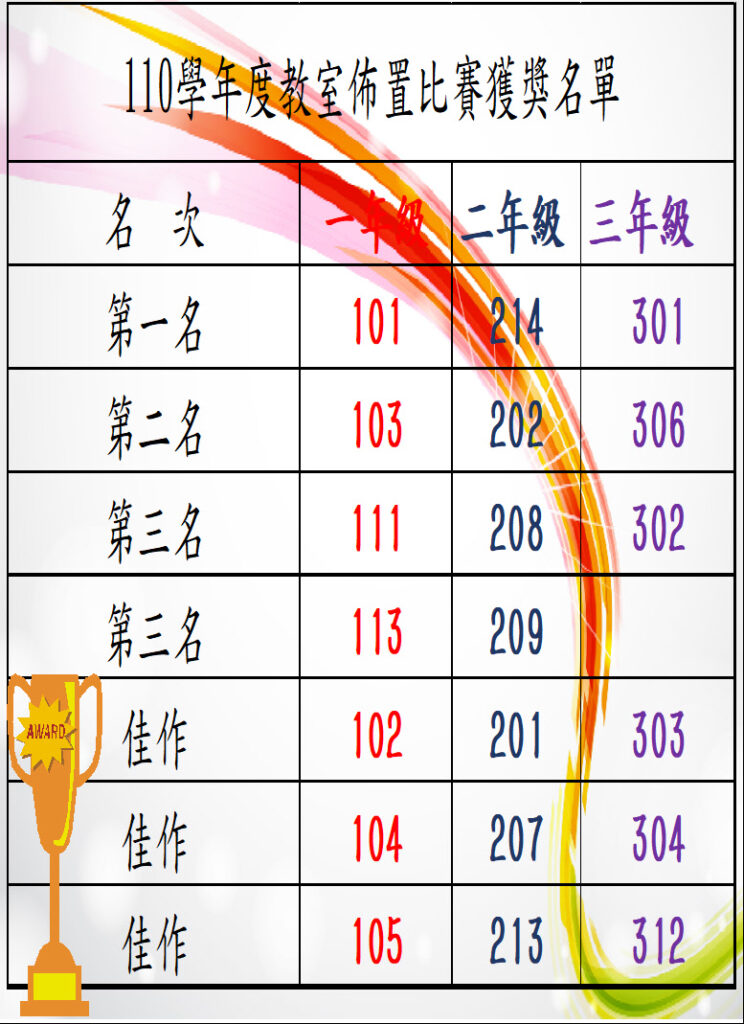 榮譽110學年度教室佈置成績公告,恭禧得獎班級,並感謝評審老師Post author:klgsh310Post published:2021-10-19Post category:校園公告 / 榮譽榜 Post Views: 92Read more articles上一篇文章國立清華大學111年寒假「探索半導體高中創客營」下一篇文章10/22(五)配合111高中英聽第一次考試,進行考場佈置及課務調整相關內容公告111學年度第一學期工讀獎助申請錄取名單公告2022-08-30轉知轉知衛生福利部業於本(111)年3月28日以衛授疾字第1110200317號公告修正「嚴重特殊傳染性肺炎(COVID-19)防疫措施裁罰規定」。2022-04-22