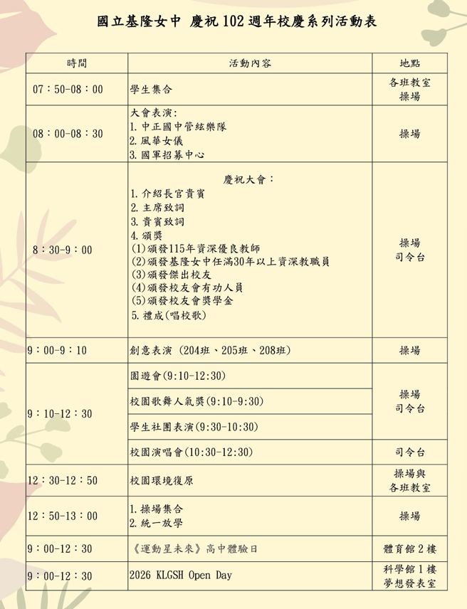 一、本校訂於115年4月11日舉行102週年校慶,並於4月13日補假一日。校慶為本校重大集會,相關作業比照校務會議辦理,當日同仁須完成簽到手續。為避免與來賓簽到時間重疊造成壅塞,請各位同仁儘早於當日上午8點前到校,並至本校操場面向司令台左側上坡路段之簽到處完成簽到作業,感謝配合。