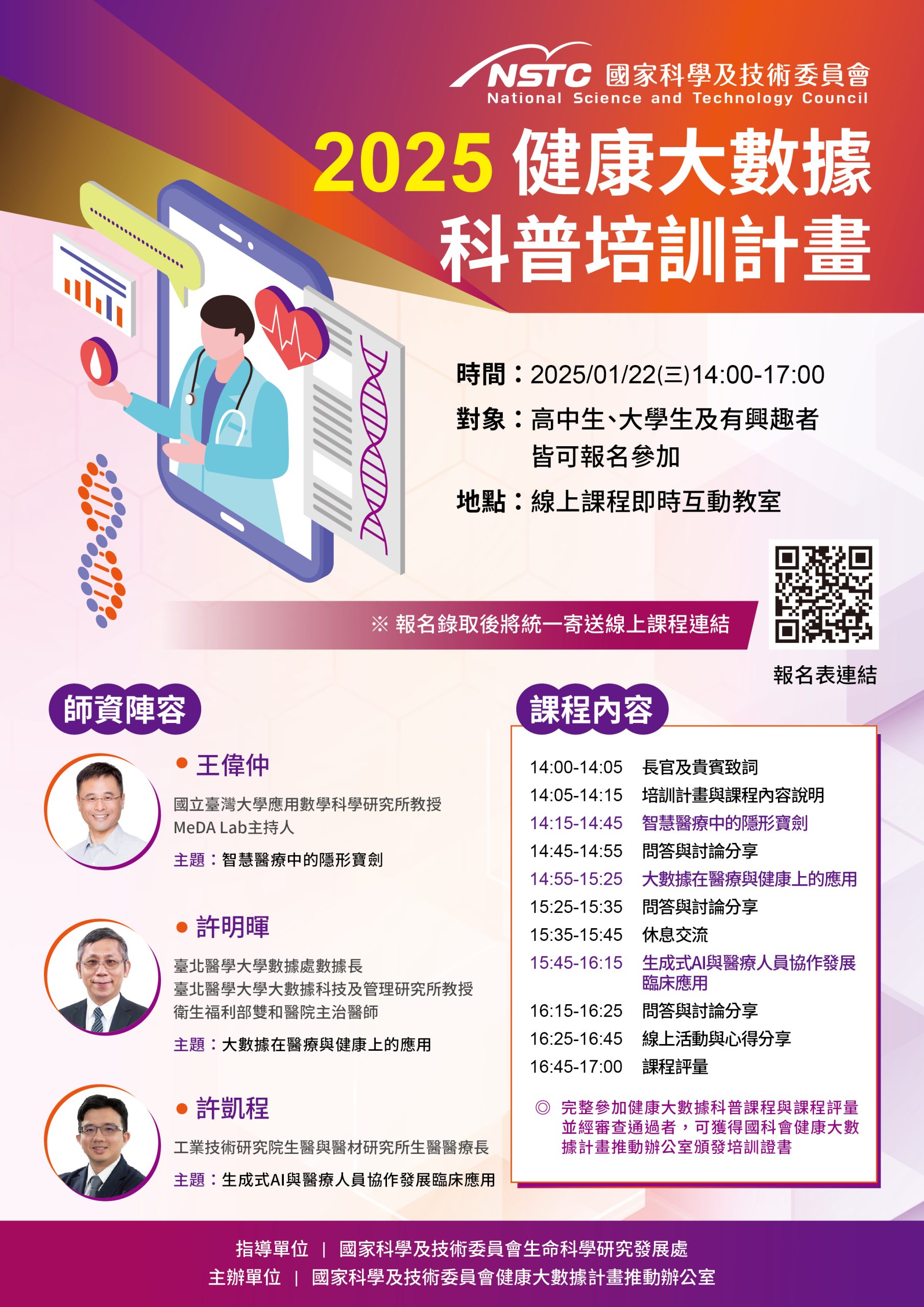 二、 兩場科普培訓課程活動擬訂於民國114年01月22日(三)14:00-17:00辦理健康大數據科普培訓計畫、民國114年01月23日(四) 09:00-12:10辦理腦科技科普培訓計畫,兩場科普培訓課程活動皆為線上課程,報名方式亦採線上報名,健康大數據科普培訓計畫報名連結https://pse.is/6ssdka,腦科技科普培訓計畫報名連結https://pse.is/6ssdfp,請欲報名者參見報名表內詳細資訊並填寫相關內容,報名截止日期為114年01月15日(三),若額滿將提前關閉報名系統。報名成功者將114年01月19日(日)前寄發線上課程連結,並邀請加入課程討論群組。