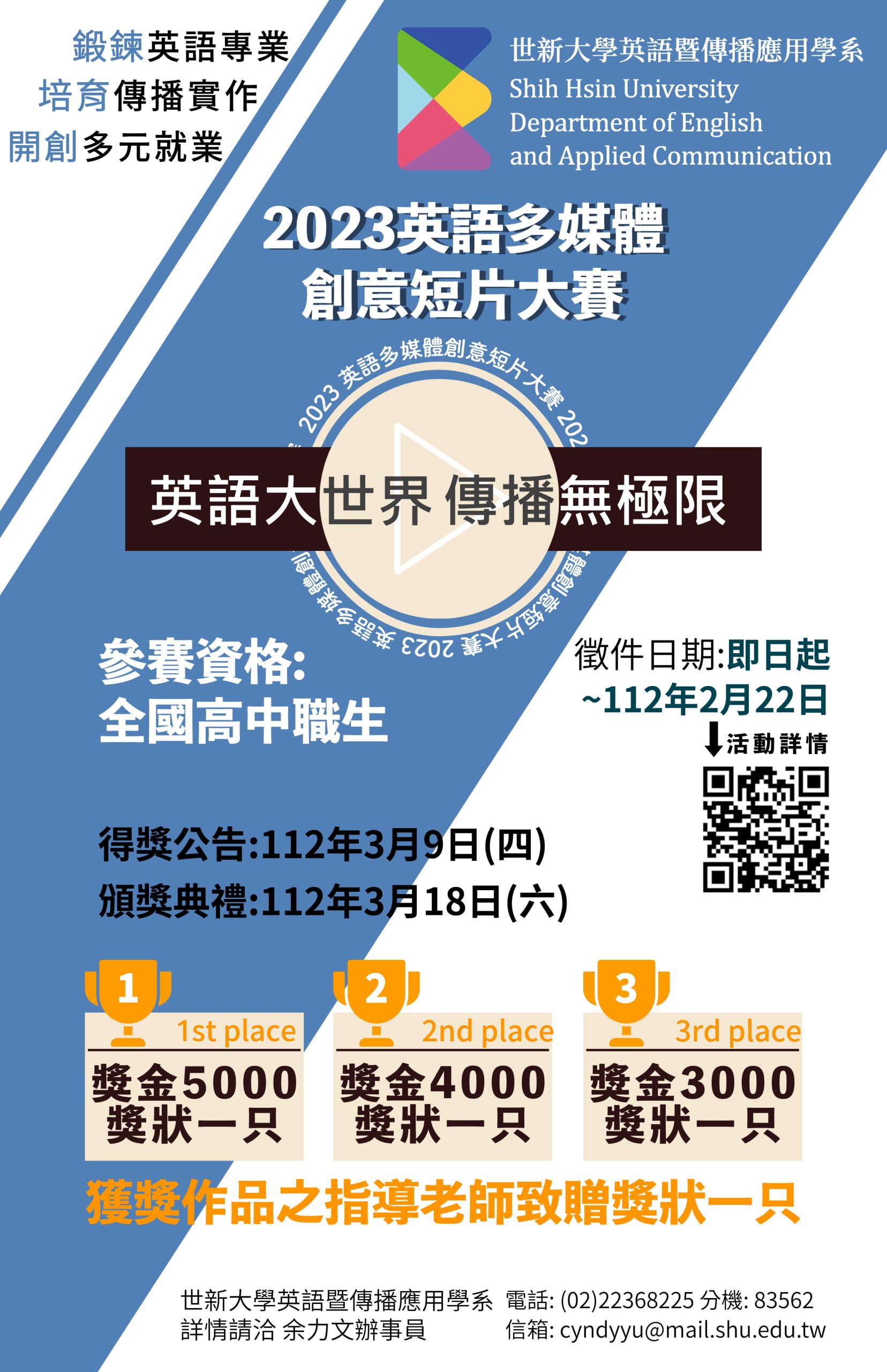 轉知世新大學英語暨傳播應用學系辦理2023 英語多媒體創意短片大賽「英語大世界傳播無極限」活動Post author:klgsh312Post published:2022-12-05Post category:校外宣導與活動說明:一、收件時間:即日起至112年2月22日(星期三)。二、活動網址:https://reurl.cc/EX6dng三、檢附比賽辦法與海報各1份。「英語大世界傳播無極限」活動-比賽辦法下載「英語大世界傳播無極限」活動-海報下載 Post Views: 57Read more articles上一篇文章世新大學財務金融學系辦理「2023世新大學財金營《漫遊華爾街》」活動,歡迎同學報名參加下一篇文章請鼓勵貴校師生踴躍參加本校電腦與通訊工程系主辦之『2022 FMRA 全國FM廣播收音機及天線創意設計競賽』,請查照。相關內容轉知教育部「2022臺灣國際學生創意設計大賽」訊息。2022-05-25有關臺中市立臺中第一高級中等學校 物理學科中心與國立東華大學物理學系、中華民國物理教育學會合作辦理「2024中華民國物理教育聯合會議」活動地點改至國立高雄大學辦理,請自然領域教師踴躍報名參加。2024-08-01