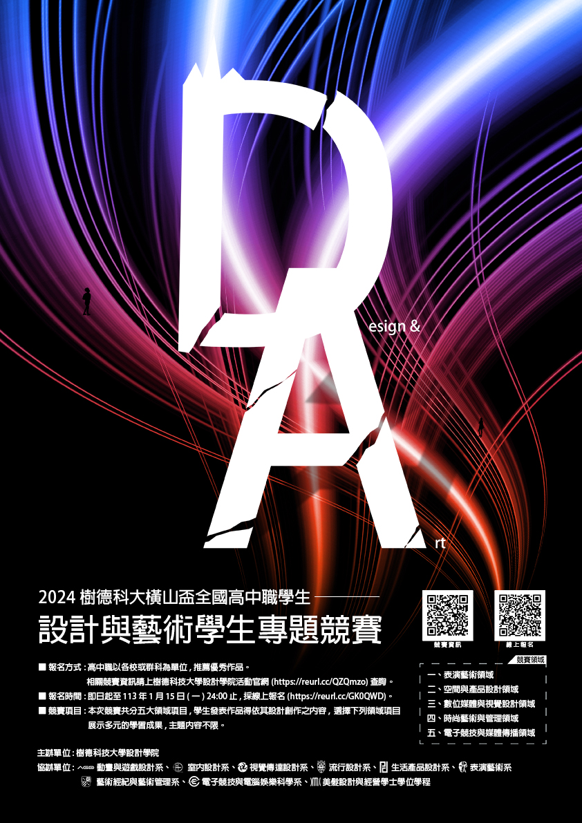 三、參賽報名及作品皆上傳平台,相關資訊請上樹德科技大學設計學院活動官網(https://reurl.cc/QZQmzo)查詢或掃描競賽海報之QRcode報名。