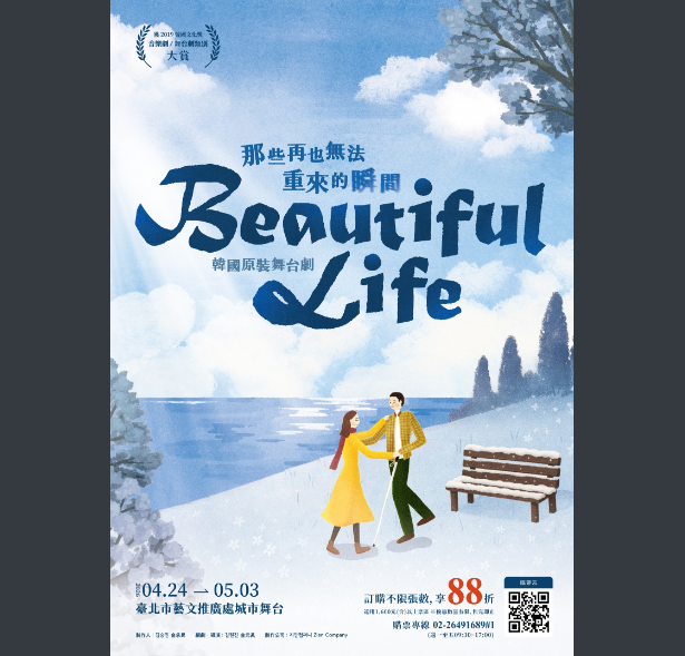 (一)《Beautiful Life》以倒敘方式講述一對平凡夫妻春植與順玉跨越時光的愛情故事。從年輕的相遇與初戀、意外離別的遺憾,到中年的磨合及老年的依偎,透過那些平凡的生活片段與日常對話,展現愛情在歲月流轉中的模樣,帶領觀眾在笑聲與淚水中回望人生最真實的情感瞬間。自2016年於首爾首演以來,深受觀眾喜愛,以長期公演之姿持續熱賣上演,是一部讓人看見愛的重量與時間溫柔的作品,提醒著我們,即使生活並不完美,愛與陪伴仍能讓日常閃耀動人。本次,將以最原汁原味的形式,帶來韓國舞台劇《Beautiful Life》的經典原版——春植與順玉的故事,藉由他們從相識相戀到離別,讓台灣觀眾跨過國際,感受與中文版不一樣,屬於原作的深刻情感與動人魅力。