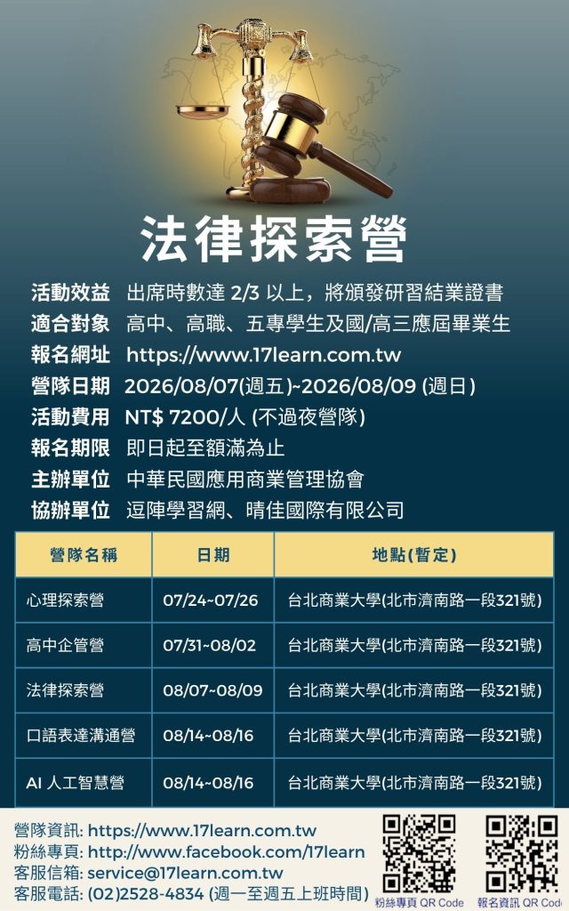 許多人覺得法律高深難懂,但其實生活中處處離不開法律,【法律探索營】將透過專業的法律課程、遊戲偵查推理、模擬法庭等多元活動,拉近學生與「法」的距離!