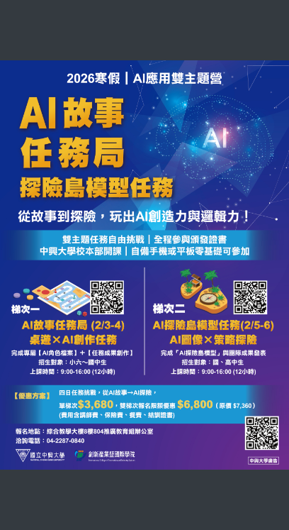 國立中興大學推廣教育課程115年寒假「AI應用-AI故事任務局及AI探險島模型任務」招生資