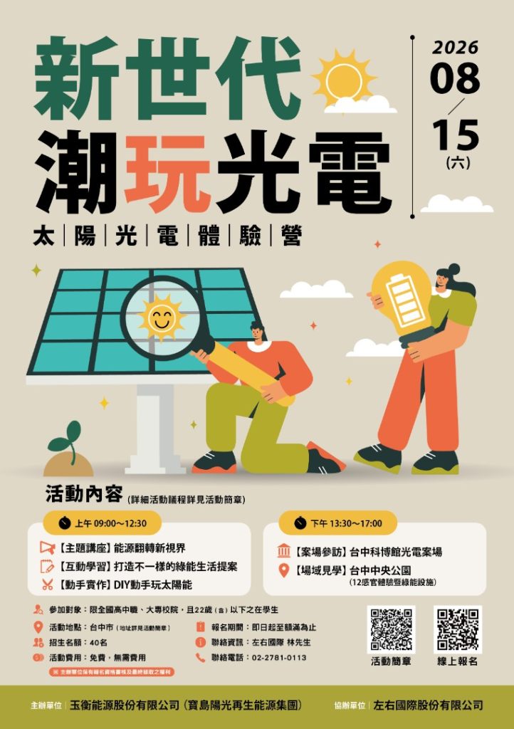 玉衡能源股份有限公司預計115年8月15日(星期六)辦理「2026年全國大專校院暨高中職學生太陽光電體驗營」Post author:klgsh600Post published:2026-04-27Post category:大學營隊/認識大學校系課程/活動 / 校外宣導與活動afc597f6-dae0-457d-8f74-bce7b48fa86f下載 Post Views: 11Read more articles上一篇文章弘光科技大學老人福利與長期照顧事業系辦理「青春不設限,『銀』向大未來」老福長照體驗營活動下一篇文章檢送教育部國民及學前教育署委請國立東華大學辦理「115年度十二年課綱原住民族教育議題融入校訂課程推廣計畫」社會領域「臺灣原住民族運動」系列講座實施計畫1份,敬請踴躍參與。相關內容基隆市教育關懷協會辦理「孩子的貴人系列家長講座最終回-大學考招知多少」線上講座2022-09-22桃園市立陽明高級中等學校辦理113學年度數位前導「戶外教育課程講座分享會計畫」,敬邀教師參加(實體或線上)。2024-12-10