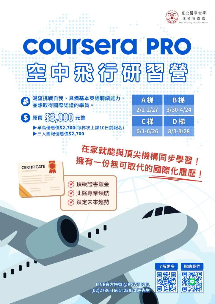 一、本校為鼓勵高中學子於寒假期間參與多元學習,將於115年2月2日起辦理【Coursera Pro空中飛行研習課程】4梯次。