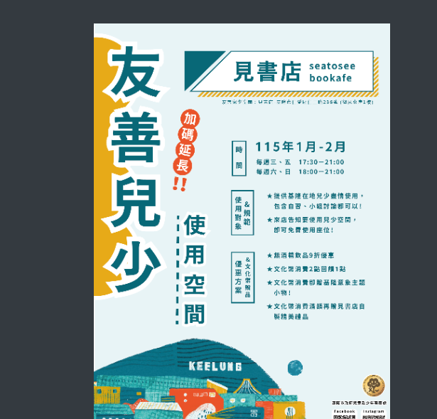 一、本府與「見書店」114年友善兒少空間使用計畫獲得熱烈迴響,因適逢115年1月為各校期末考及大學學測考試,爰與見書店合作延長友善兒少空間開放使用。