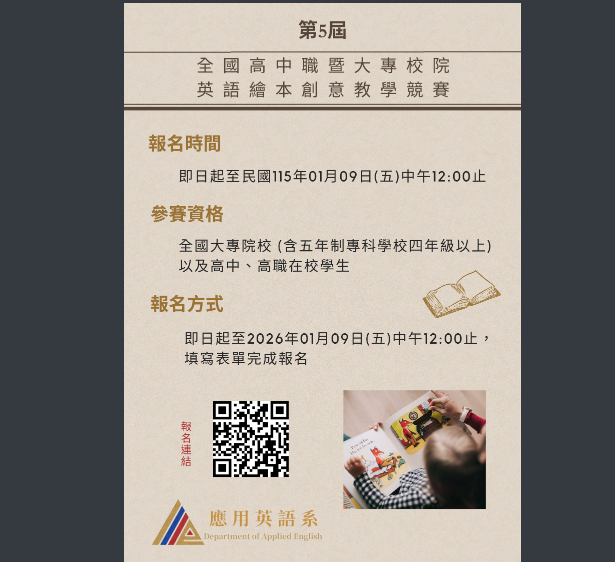 轉知朝陽科技大學應用英語系辦理「第5屆全國高中職暨大專校院英語繪本創意教學競賽」