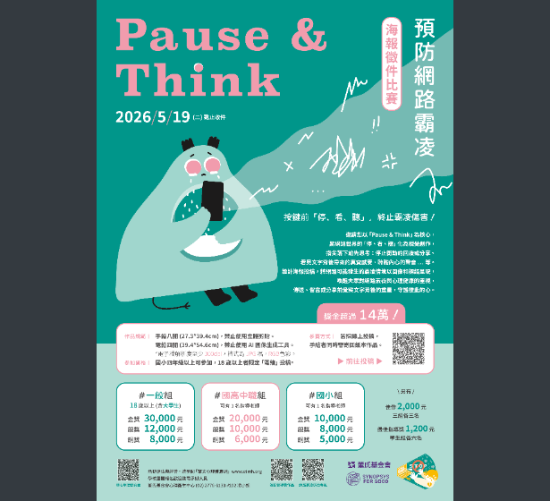 二、為提升兒童與青少年、老師及社會大眾對網路霸凌議題的重視,關心網路使用素養與心理健康的影響,本會舉辦【Pause & Think】停止網路霸凌海報徵件比賽,即日起開始收件至民國115年5月19日止,邀請學生與老師以手繪或電繪方式創作海報投稿,得獎作品可獲獎金,國小組金獎一萬元、國高中職組金獎兩萬元、一般組金獎三萬元.等,共30個獎項,總獎金超過14萬元。活動辦法請參閱https://reurl.cc/lpRGLE 。