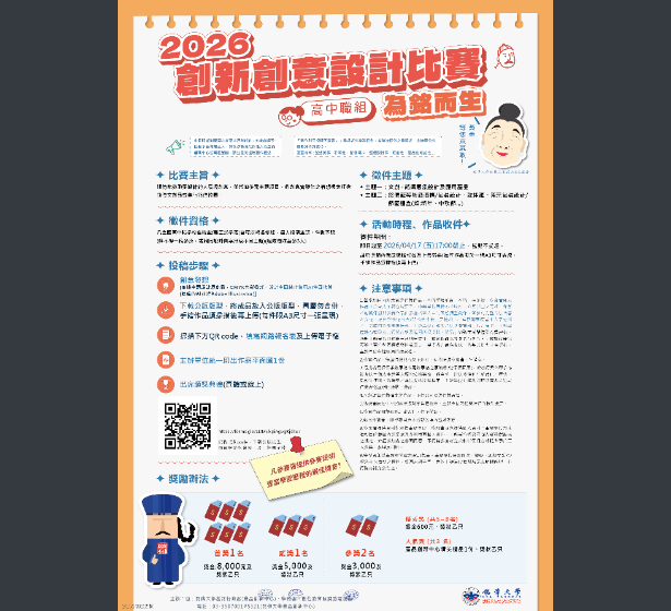 二、參賽資格:凡全國高中職學校在校生(具正式學籍)皆可以報名參加,每人投稿主題、件數不限(唯不得一稿多投,或相同設計圖案投稿不同主題)(組隊每隊至多3人)。