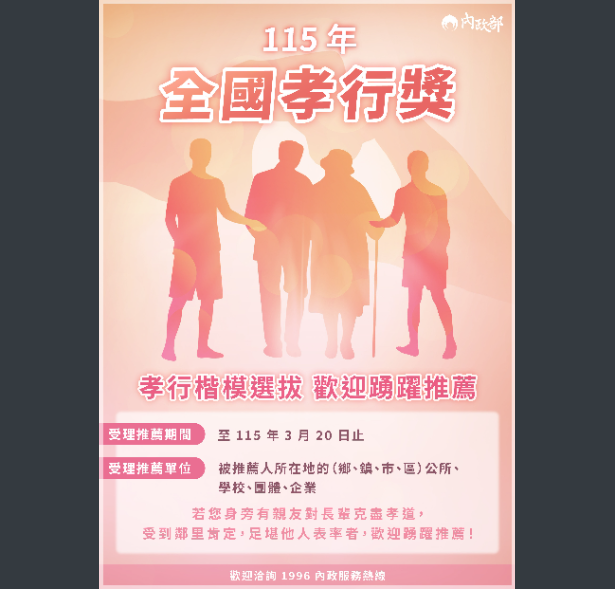115年全國孝行獎孝行楷模選拔Post author:klgsh310Post published:2026-01-21Post category:校園公告 / 校外宣導與活動說明:一、依教育部115年1月8日臺教學(二)字第1140139554號書函辦理。二、請於網站、通訊軟體LINE官方帳號、社群網頁、群組等管道廣為宣傳旨揭圖檔,鼓勵各界踴躍推薦,參與孝行楷模選拔。 Post Views: 8Read more articles上一篇文章國營臺灣鐵路股份有限公司115年從業人員甄試下一篇文章本協會辦理「2026韓國世界發明創意競賽」,敬請惠予公告並轉知貴校師生踴躍參加。相關內容113學年度第2學期期末校務會議謹訂於114年6月30日中午12時召開2025-05-19置頂公告112-2高一「自主探索 成就學習」講座填選結果2024-02-21