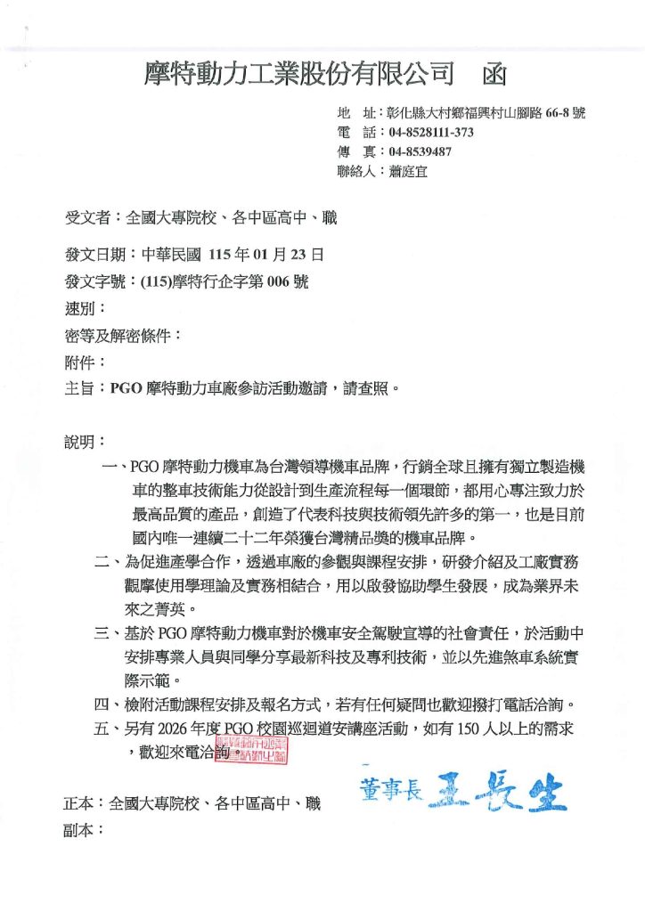 PGO 摩特動力車場參訪活動Post author:klgsh310Post published:2026-02-10Post category:校園公告 / 校外宣導與活動 Post Views: 5Read more articles上一篇文章PGO Ride Story 創意短影音大賽下一篇文章轉知長榮大學敬邀參與「第二屆生成式AI智慧居家照護虛擬代理人創新應用競賽」相關內容亞洲大學護理系日間部招生宣導2025-12-08置頂公告112第二次高中英聽測驗12/10(六)基隆考區公告2022-12-06